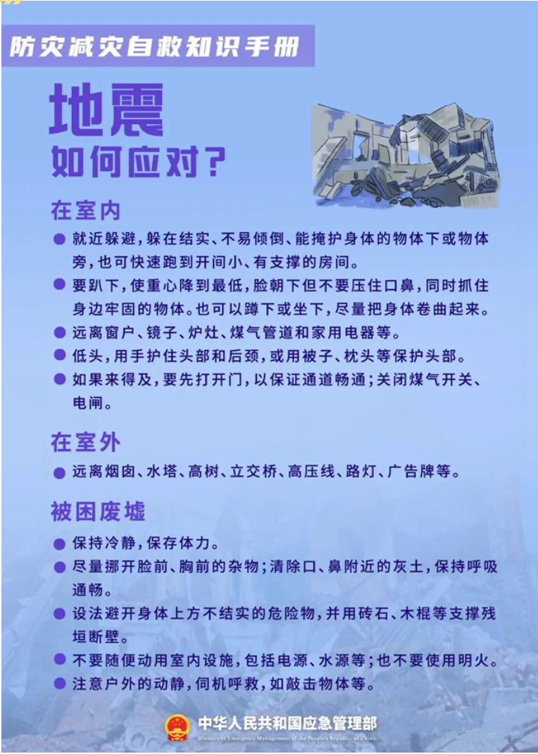 2008年5月12日,一场有着巨大破坏力的地震在四川汶川发生,造成重大人员伤亡和财产损失。为进一步增强全民防灾减灾意识,推动提高防灾减灾救灾工作水平,经国务院批准,从2009年开始,每年的5月12日定为“全国防灾减灾日”。今年5月12日是我国第15个全国防灾减灾日,今年全国防灾减灾日主题为“防范灾害风险 护航高质量发展”,5月6日至12日为防灾减灾宣传周。