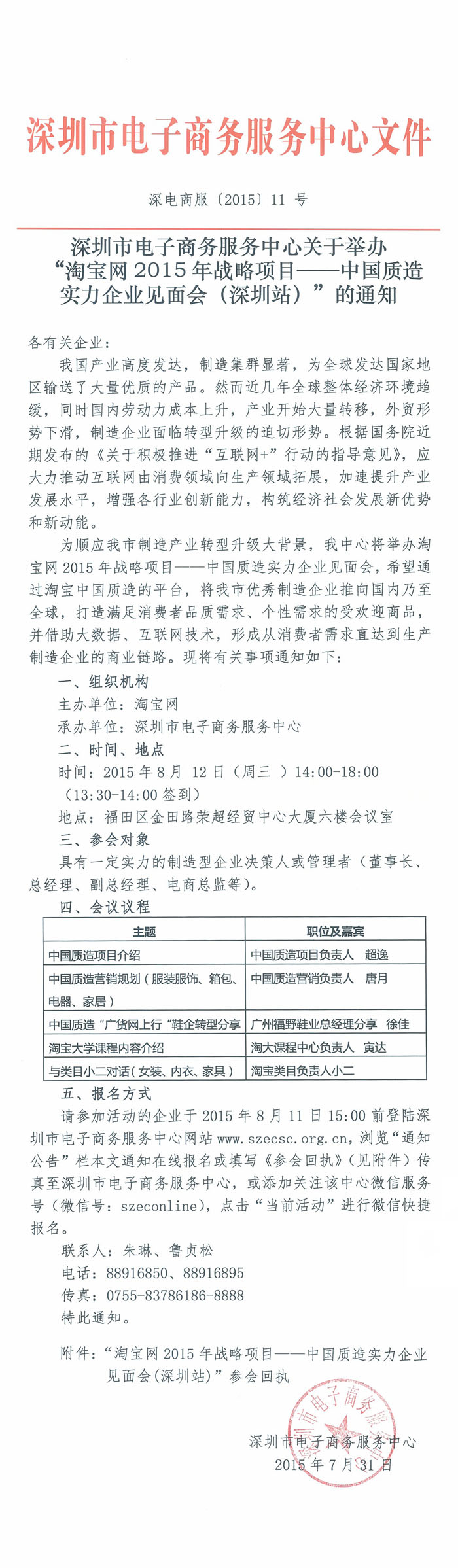 关于举办“淘宝网2015年战略项目——中国质造实力企业见面会(深圳站)”的通知