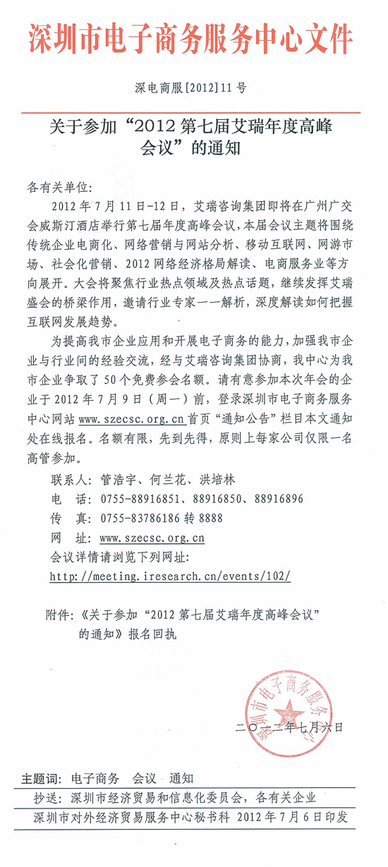 关于参加“2012第七届艾瑞年度高峰会议”的通知