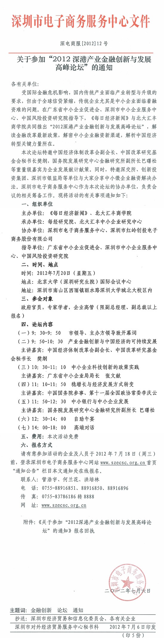 关于参加“2012深港产业金融创新与发展高峰论坛”的通知