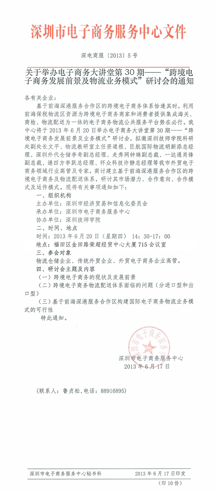 关于举办电子商务大讲堂第30期——“跨境电子商务发展前景及物流业务模式”研讨会的通知