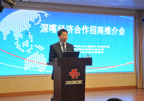 5月18日,受喀什地区行政公署的委托,由我中心承办的“深喀经济合作招商推介会”在经贸中心顺利召开。由喀什地委委员、行署副专员陈志江任团长,广东援疆前方指挥部副总指挥、行署副专员王晓昀,深圳援疆前方指挥部副总指挥、喀什经济开发区党工委委员、管委会副主任刘仕哲任副团长,喀什经济开发区、喀什综合保税区、喀什地区发改委、疏附县、伽师县、塔什库尔干县相关领导参加的喀什地区经贸代表团参加会议,深圳市政府副秘书长朱廷峰出席会议并致辞。