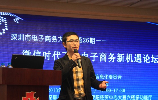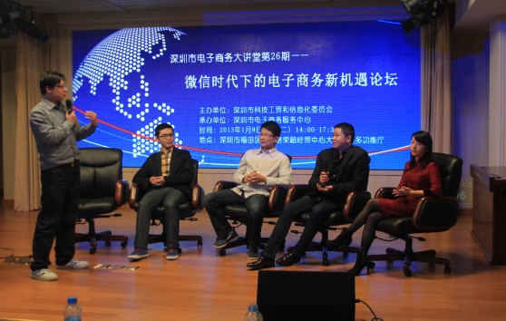 由深圳市经济贸易和信息化委员会主办,深圳市电子商务服务中心承办的第二十六期电子商务大讲堂--“微信时代下的电子商务新机遇”论坛于2013年1月8日在市经贸中心大厦6楼拉开帷幕。市电子商务服务中心主任陈巧华女士代表承办方出席论坛并致辞,金种子创投公司创始人董江勇、浙报集团传媒梦工厂总监朱晓鸣、皮皮精灵助理总裁管鹏、盛世瑞智国际文化传媒集团CEO赵黎、真购网副总经理方雨等嘉宾出席活动,论坛吸引深圳地区300多位电子商务和传统企业代表参会。